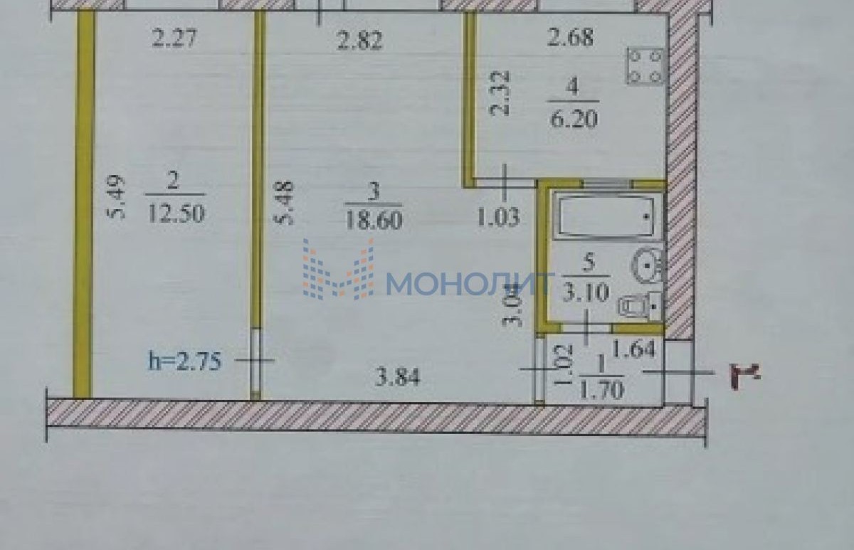 Квартира расположена на 2 этаже 4-этажного дома. Общая площадь —42,1м², жилая - 31,1м², кухня — 6,2 м²