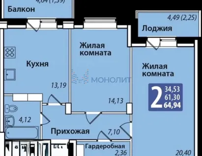 2-комнатная квартира 65 м² 16/16 эт.